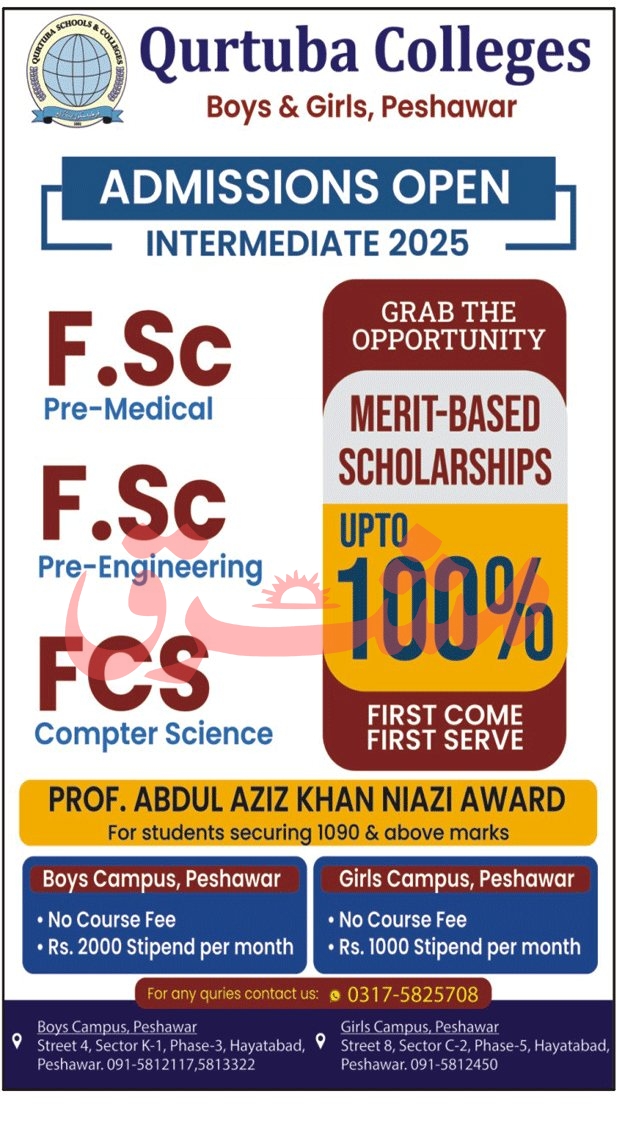 Qurtuba-college Boys & Girls Campuses, Peshawar proudly announce that admissions are now open for Intermediate Programs Session 2025. As one of the region’s leading educational institutions, Qurtuba offers an excellent academic environment backed by scholarships and rewards for high achievers.
