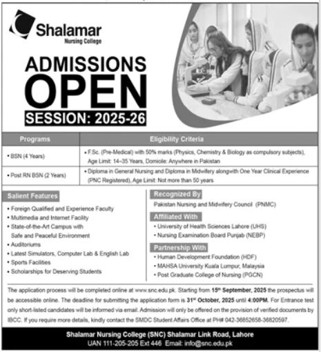 Shalamar Nursing College, a leading institution in healthcare education, is now accepting applications for its prestigious nursing programs for the academic session 2025–2026.