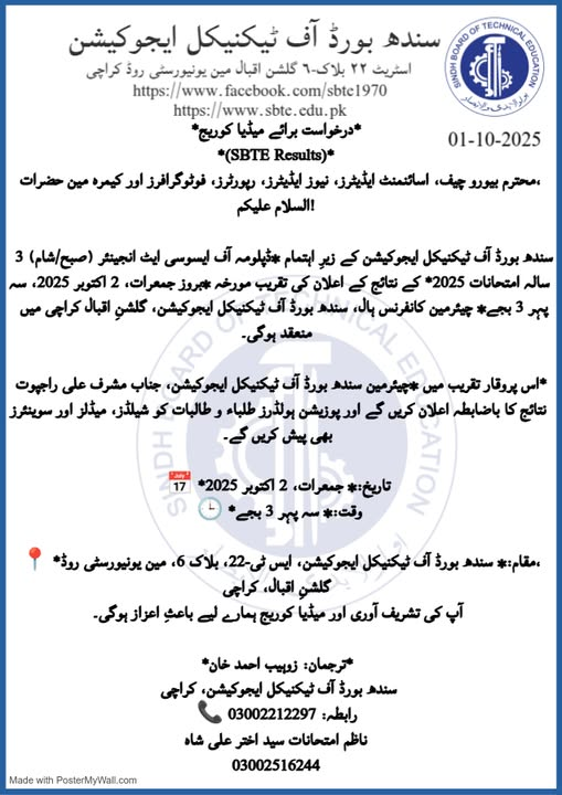 Karachi, Sindh Board of Technical Education Karachi has made all necessary arrangements to announce their Diploma of Associate Engineer Morning / Evening third year annual exams 2025 result. The students, teachers and parents of the students attended the ceremony on 02-10-2025 at 3:00 pm in the conference hall of the board. The students can get the latest updates of SBTE DAE Morning & Evening Annual Exams Result 2025.