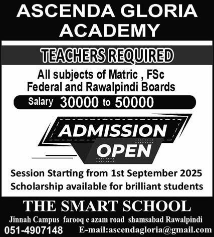 Ascenda Gloria Academy is also hiring qualified and passionate teachers for all subjects at Matric and F.Sc levels.