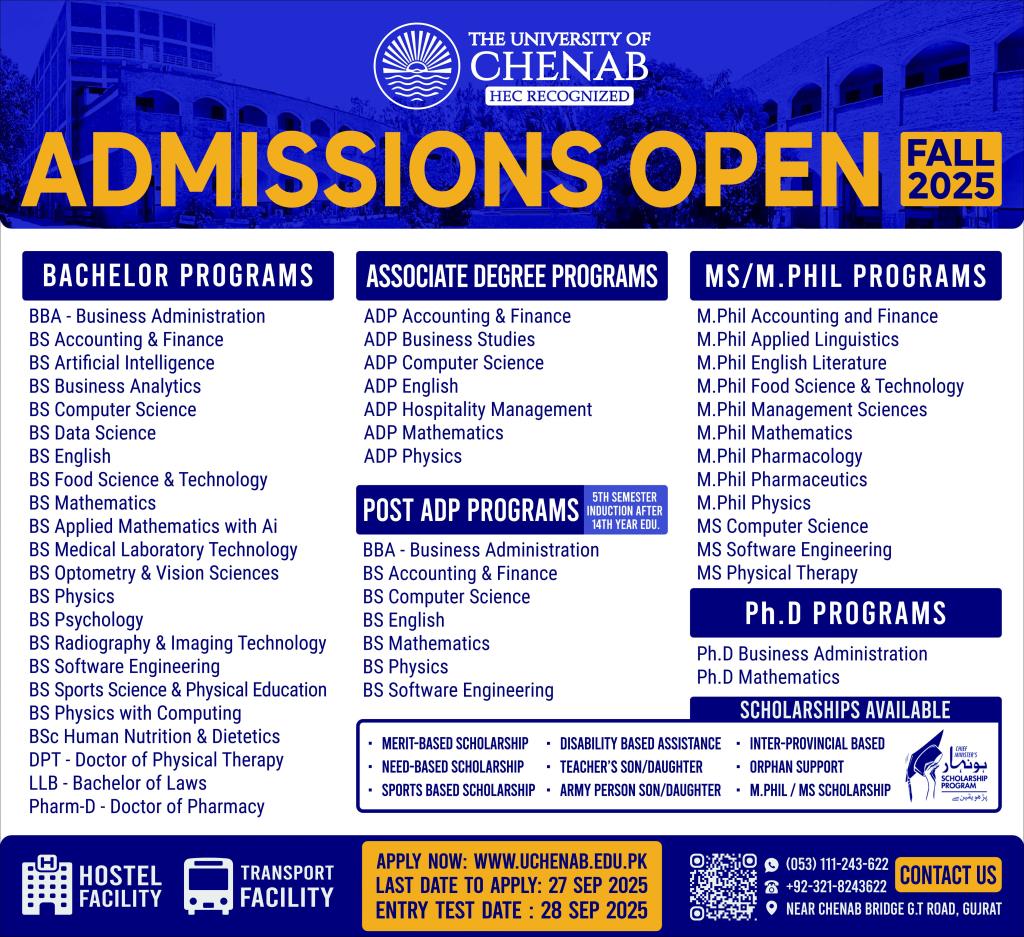 The University of Chenab UoC – an HEC-recognized institution – is now accepting admissions for Fall 2025 in a wide range of Bachelors, Associate, Post-ADP, MPhil/MS, and PhD programs.