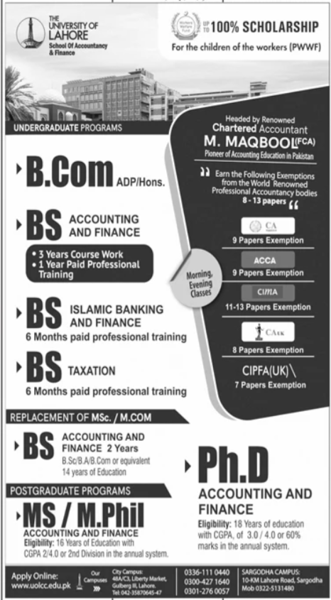The School of Accountancy & Finance at The University of Lahore UoL invites applications for Undergraduate, Postgraduate, and Ph.D. programs in Accounting, Finance, Taxation, and Islamic Banking for the Fall 2025 intake.