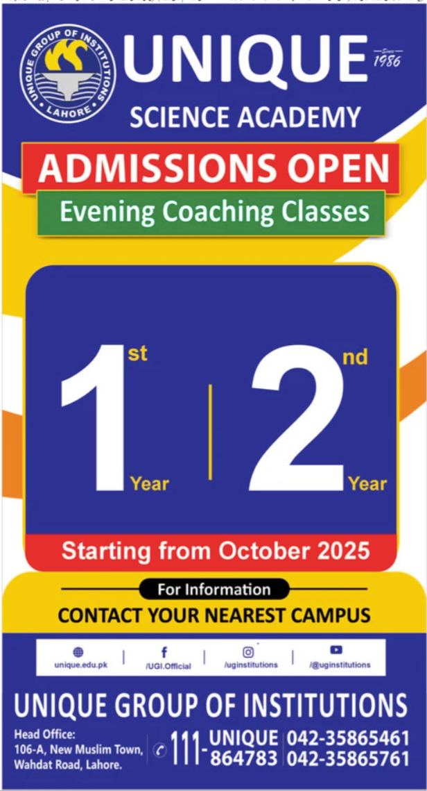 The Unique Group of Institutions is now accepting admissions for FSC Pre-Medical, FSC Pre-Engineering, and ICS for the upcoming academic session beginning in October 2025.