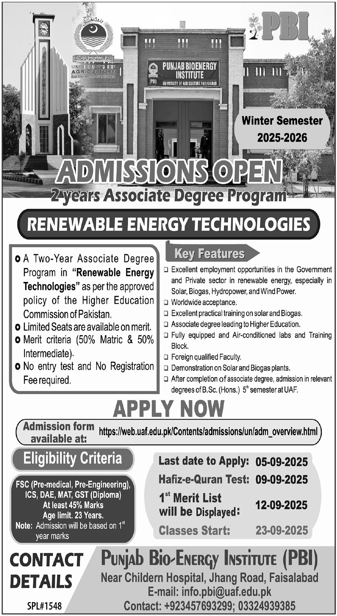 The Punjab Bioenergy Institute PBI, University of Agriculture Faisalabad UAF, is now accepting applications for its 2-Year Associate Degree Program in Renewable Energy Technologies. This HEC-approved program is designed to produce skilled professionals in one of the world’s fastest-growing and in-demand sectors — renewable energy.