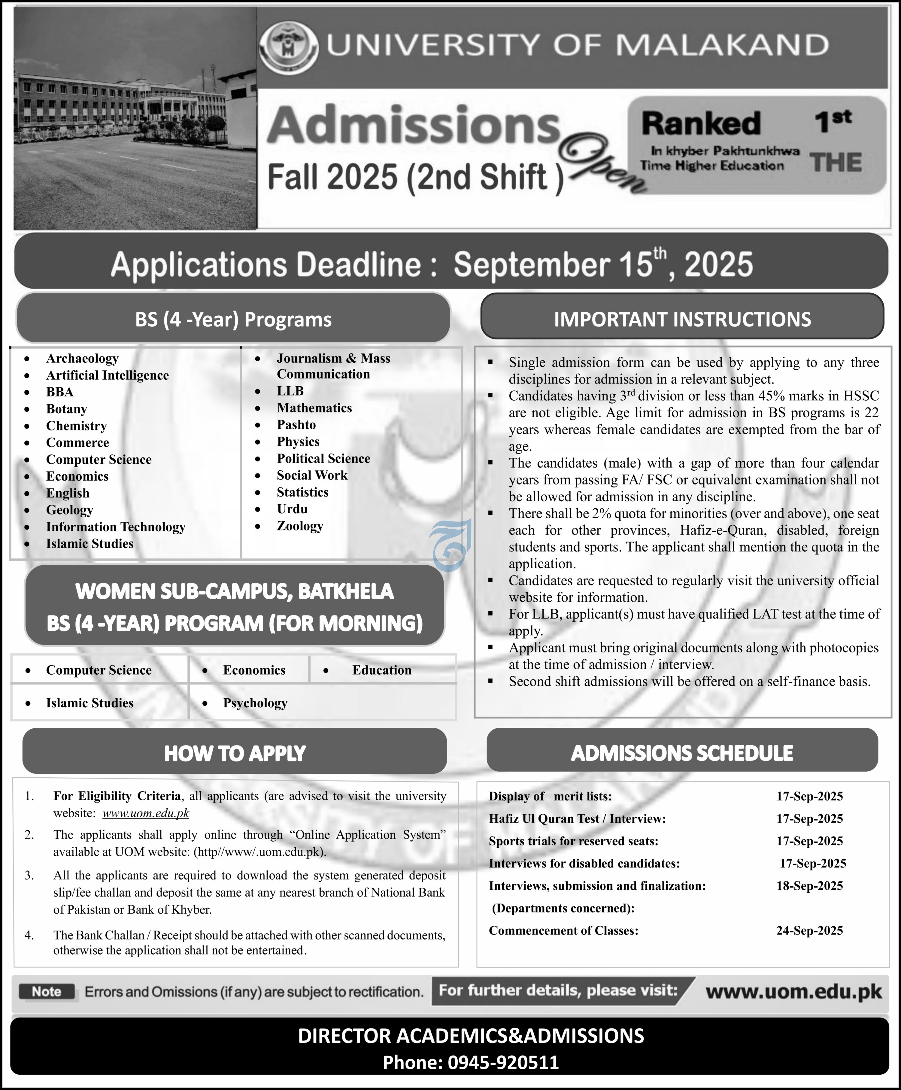 The University of Malakand uom is pleased to announce that admissions for Fall 2025 2nd Shift are now open for a wide range of BS 4-Year degree programs. Applications are invited from eligible candidates for admission to both the main campus and the Women Sub-Campus, Batkhela.