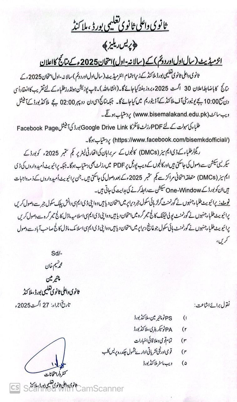 This notification was officially released on 27 August 2025, under the signature of Muhammad Naseem Khan, Chairman BISE Malakand.