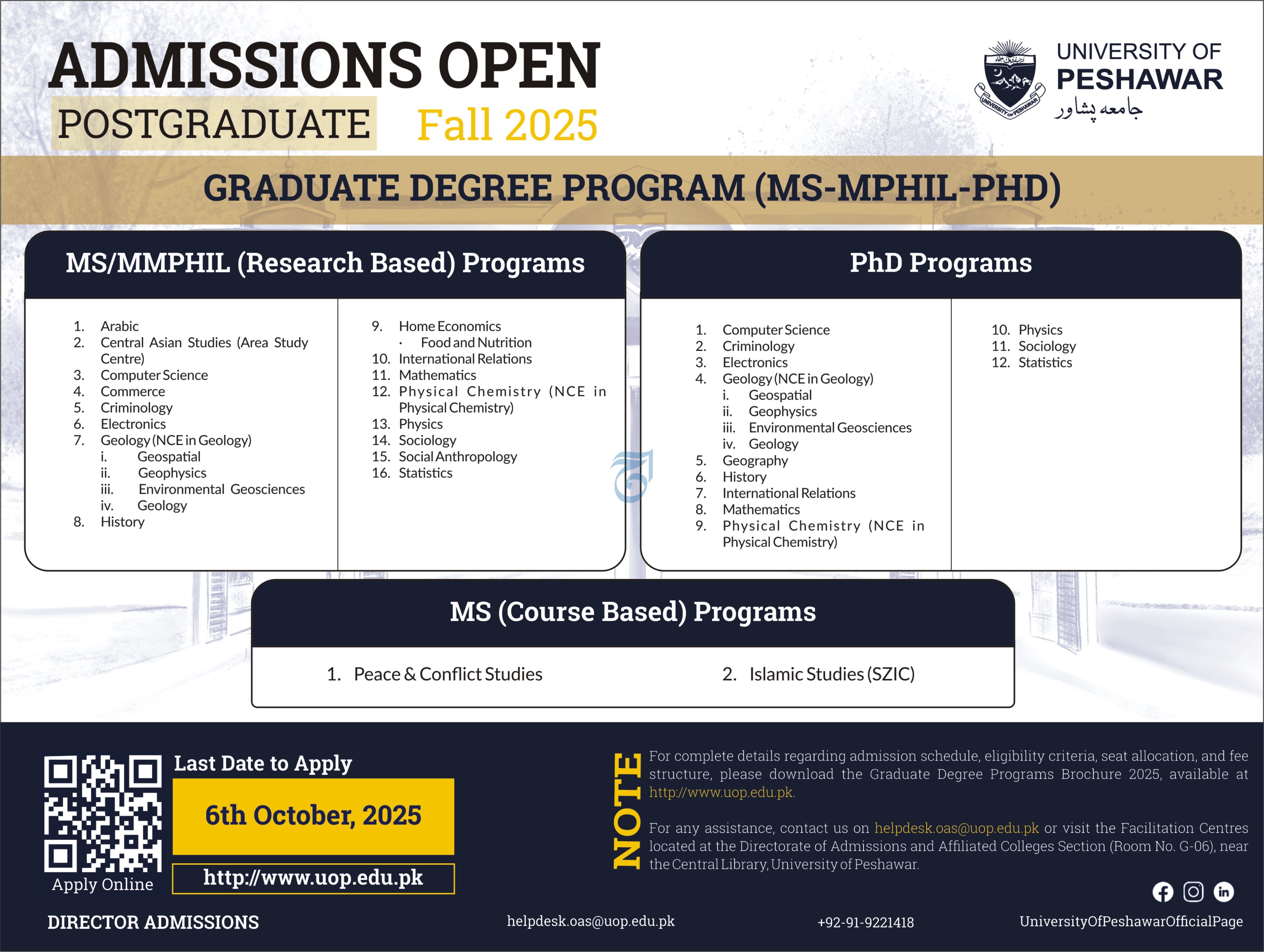 The University of Peshawar UoP, a premier higher education institution in Pakistan, invites applications for admission to its Postgraduate Programs MS, MPhil, PhD for the Fall 2025 semester.