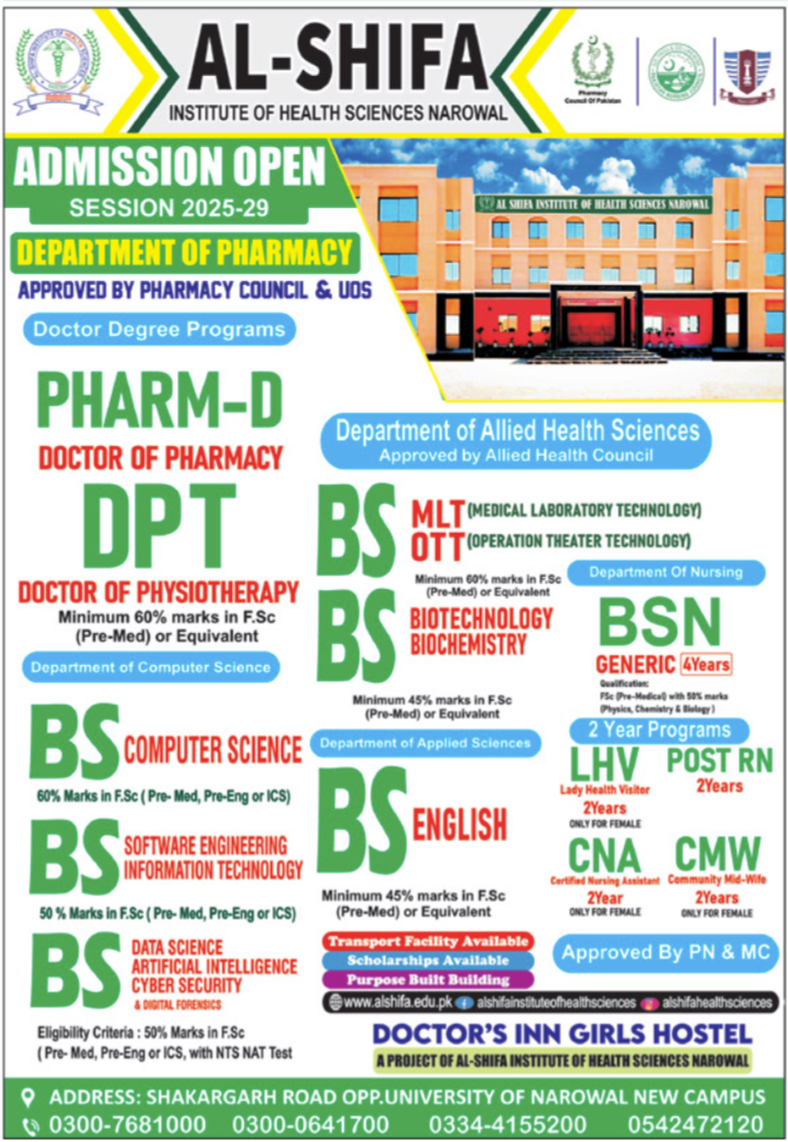 The Al-Shifa Institute of Health Sciences, Narowal is now accepting applications for admissions 2025-2029 are now open. The institute offers a wide range of health, medical, and technology programs approved by the relevant councils, providing students with a pathway to professional excellence.