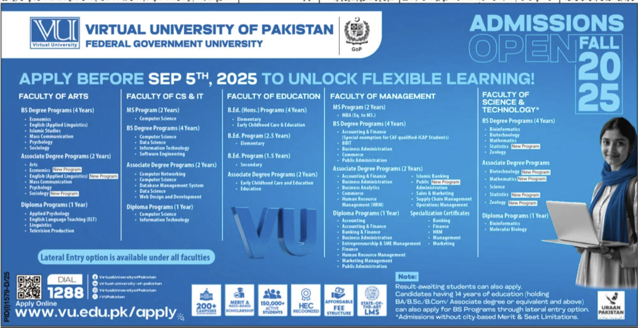 Virtual University of Pakistan VU, a pioneer in online education and a recognized Federal Government University, is now accepting applications for Fall 2025. With a mission to make higher education accessible, flexible, and affordable, VU offers a wide range of degree, diploma, and certificate programs across multiple faculties through its state-of-the-art Learning Management System LMS.