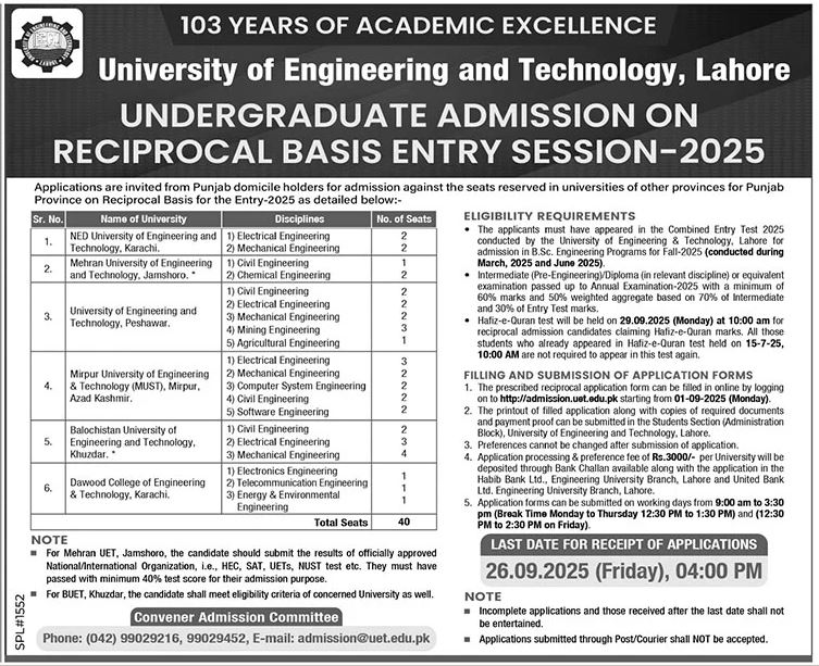 The University of Engineering and Technology UET, Lahore invites applications from Punjab-domiciled candidates for Undergraduate Admissions 2025 on Reciprocal Basis in various prestigious engineering institutions across Pakistan. This opportunity allows students from Punjab to apply for reserved seats in other provincial universities as part of the national academic exchange initiative.