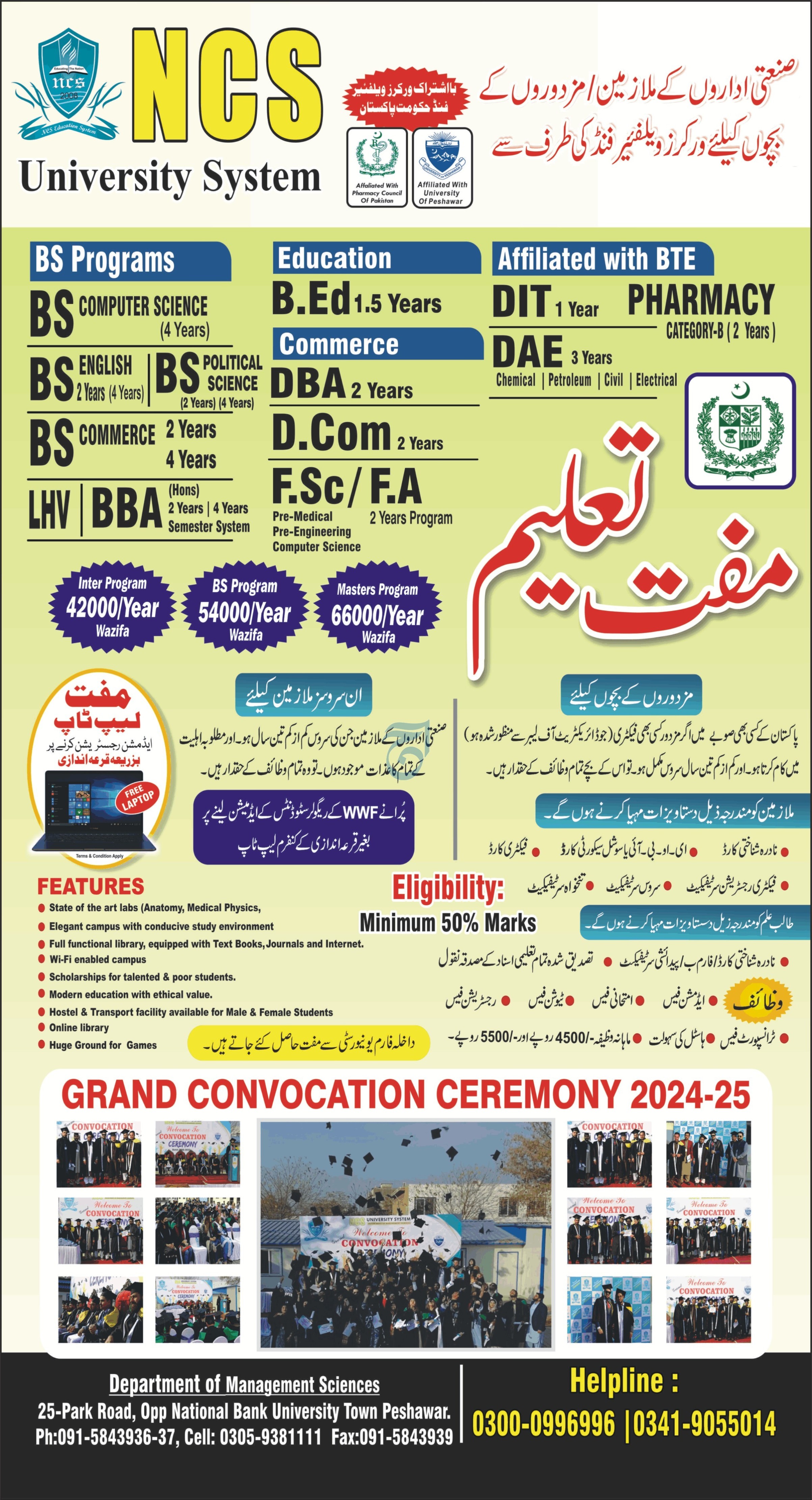 NCS University System, a project of Ves Education System, proudly opens Fall 2025 Admissions for a wide range of degree, diploma, and inter programs across its state-of-the-art Peshawar campus.