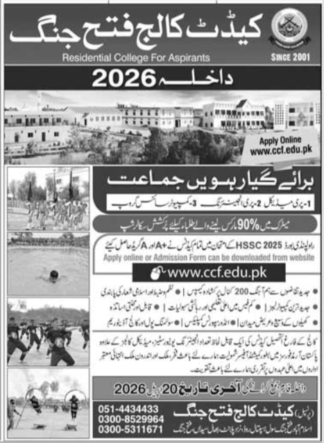 The prestigious Cadet College Fateh Jang has officially opened its enrollment cycle for the 2026 academic session. Known as a "Residential College for Aspirants," the institution has built a reputation for academic discipline and character building since its inception in 2001. As a premier boarding institution, the CCF Admissions 2026 session is designed to prepare students for leadership roles in the Pakistan Armed Forces and professional sectors.