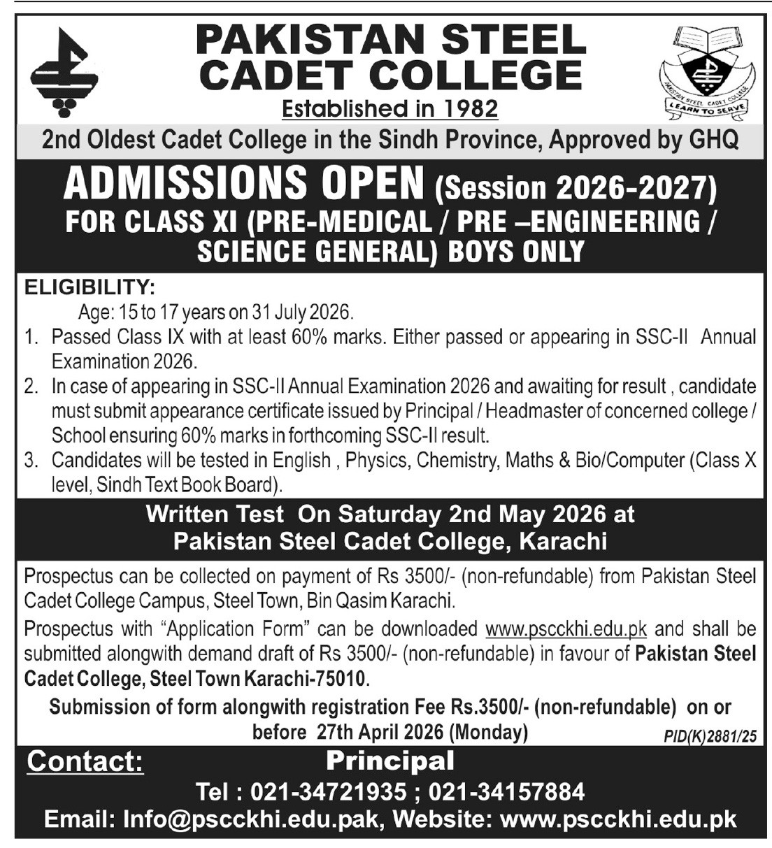 Pakistan Steel Cadet College referring here to the prestigious Pakistan Steel Cadet College has officially announced that admissions 2026 are now open for Class XI. As the second oldest cadet college in the Sindh province and a GHQ-approved institution established in 1982, the college continues its legacy of academic and disciplinary excellence.