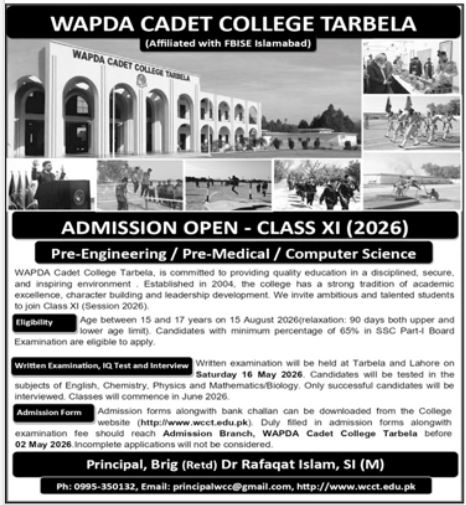 11th Class Admissions at WAPDA Cadet College Tarbela
