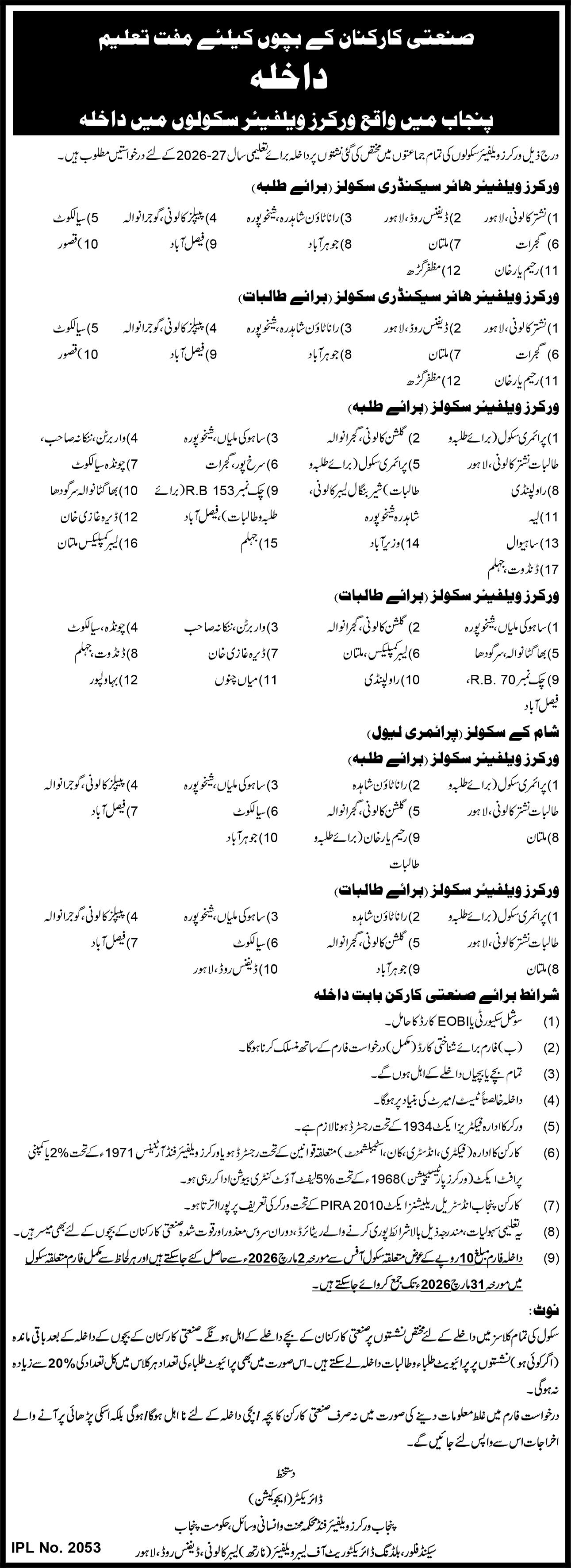 The Punjab Workers Welfare Fund PWWF has officially announced its academic intake for the 2026-27 session. This initiative, under the Punjab Workers Welfare Fund , provides a massive opportunity for industrial laborers to secure a bright future for their children through free, high-quality education. The PWWF Admissions 2026 covers a network of Workers Welfare Schools across the province, spanning primary to higher secondary levels.