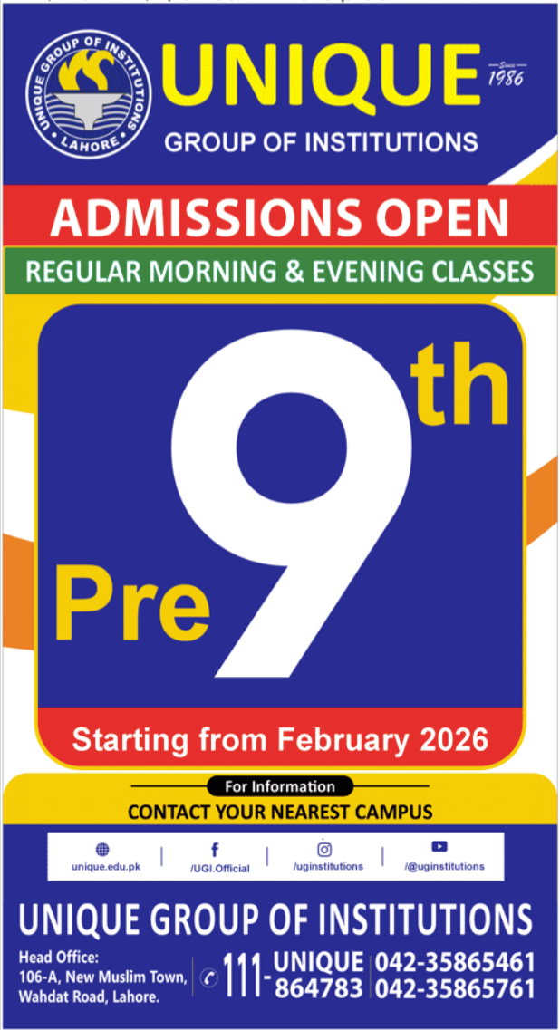 The Unique Group of Institutions has officially declared that admissions are now open for its prestigious Pre-9th program. As a cornerstone of academic excellence in Lahore since 1986, the institution continues its tradition of preparing students for rigorous board examinations through specialized foundation courses. The UGI Admissions 2026 cycle is designed to provide students with a competitive edge by starting their academic journey early.