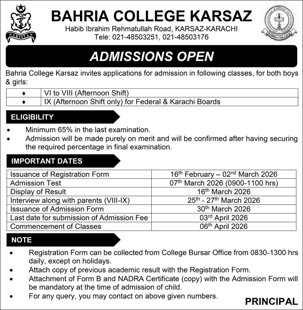 Bahria College Karsaz has officially announced the commencement of its admission cycle for the upcoming academic year. As a premier educational institution located on Habib Ibrahim Rehmatullah Road in Karachi, the college continues its tradition of academic excellence by inviting applications for both boys and girls. For those seeking a disciplined and high-standard learning environment, BCK Admissions 2026 represents a significant opportunity to secure a seat in one of the city’s most reputable colleges.