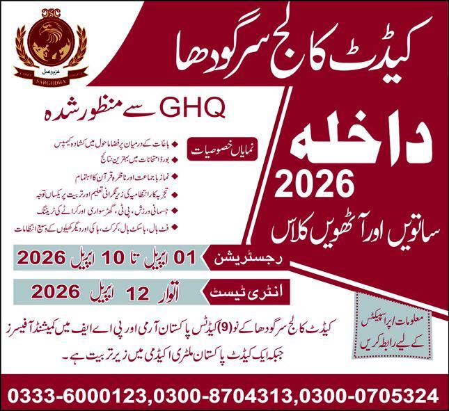 7th&8th Class Admissions 2026 open at Cadet College Sargodha