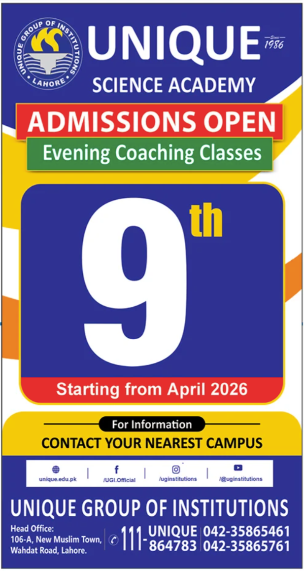 Unique Science Academy, a part of the Unique Group of Institutions, is now inviting applications for its Evening Coaching Classes for 9th Grade students starting from April 2026. Established in 1986, the academy has a long-standing reputation for providing high-quality education, dedicated coaching, and personalized guidance to help students excel in science and related subjects