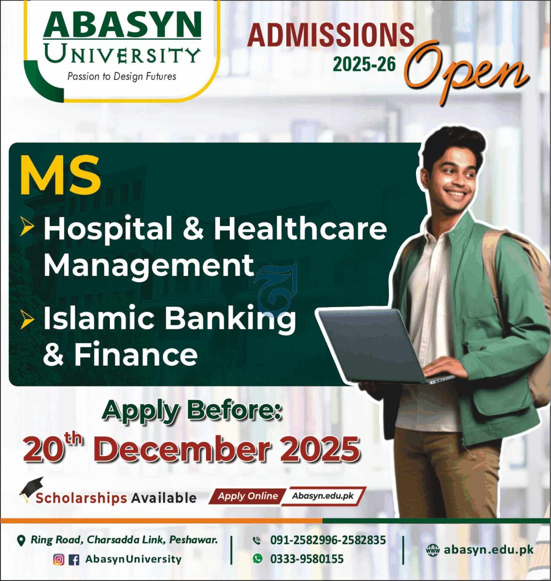 Abasyn University, a leading institution committed to academic excellence and innovation, is delighted to announce that admissions for the 2025–26 academic session are now open. The university invites applications from motivated professionals and graduates seeking advanced qualifications in specialized fields that meet the demands of modern industries.