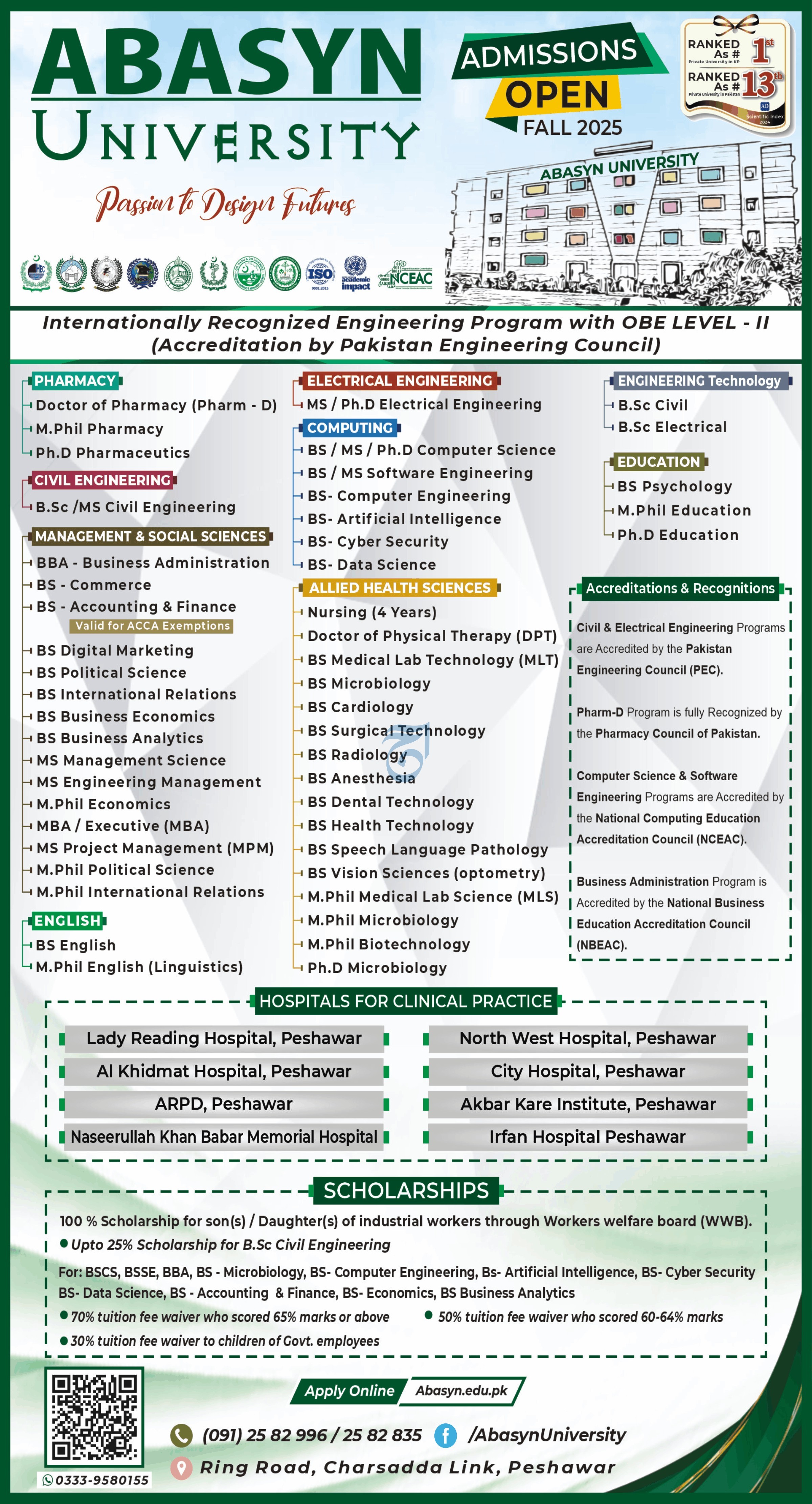 Abasyn University, a top-ranked private university in Khyber Pakhtunkhwa and among the leading private institutions in Pakistan, proudly announces that admissions are now open for Fall 2025. The university offers a wide range of undergraduate, graduate, and doctoral programs across disciplines with internationally recognized accreditations and a focus on academic excellence, innovation, and industry relevance.
