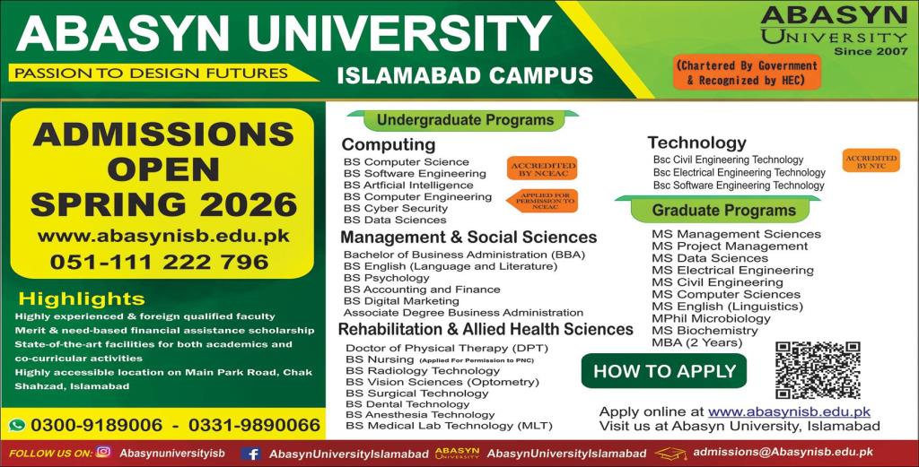 Abasyn University, a chartered institution recognized by the Higher Education Commission HEC and serving students since 2007, has announced admissions for Spring 2026 at its Islamabad Campus. The university offers a diverse range of undergraduate and graduate programs designed to prepare students for academic excellence and professional success.