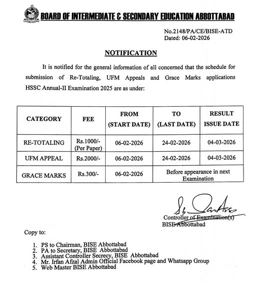 The Abbottabad board has further stated that the results of re-totaling and UFM appeal cases will be issued on March 4, 2026. Students are advised to follow the given schedule carefully to avoid missing deadlines.