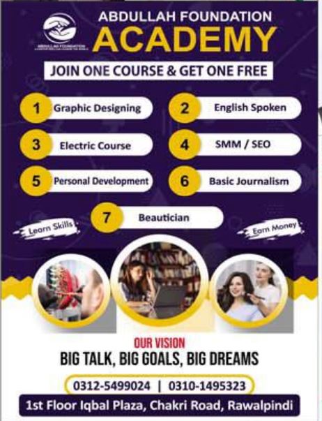 Abdullah Foundation Academy Rawalpindi is started to offer the Abdullah Foundation Academy Admissions 2022 for Session 2022. Abdullah Foundation Academy has been opened this opportunity for Aspirants who want to do Spoken and IT courses. Abdullah Foundation Academy is looking for applications from interested candidates for granting the Abdullah Foundation Academy Rawalpindi Admissions 2022. Abdullah Foundation Academy Courses Admissions 2022 are open in Graphic Designing, English Spoken, Electric Course, SMM / SEO, Personal Development, Basic Journalism, Beautician. Abdullah Foundation Academy Courses Admissions 2022 are stepping.