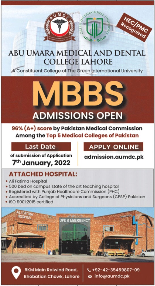 Abu Umara Medical & Dental College Lahore, HEC / PMC Recognized, A Constituent College of The Green International University is inviting applications to interested candidates who want to get enrolled in Abu Umara Medical & Dental College Lahore. Admissions are decided to open in MBBS for Academic Session 2021-2022. Candidates who want to avail above mentioned courses are directed to collect Admission Forms and submit along with required documents on or before January 07, 2022. Admissions are open.