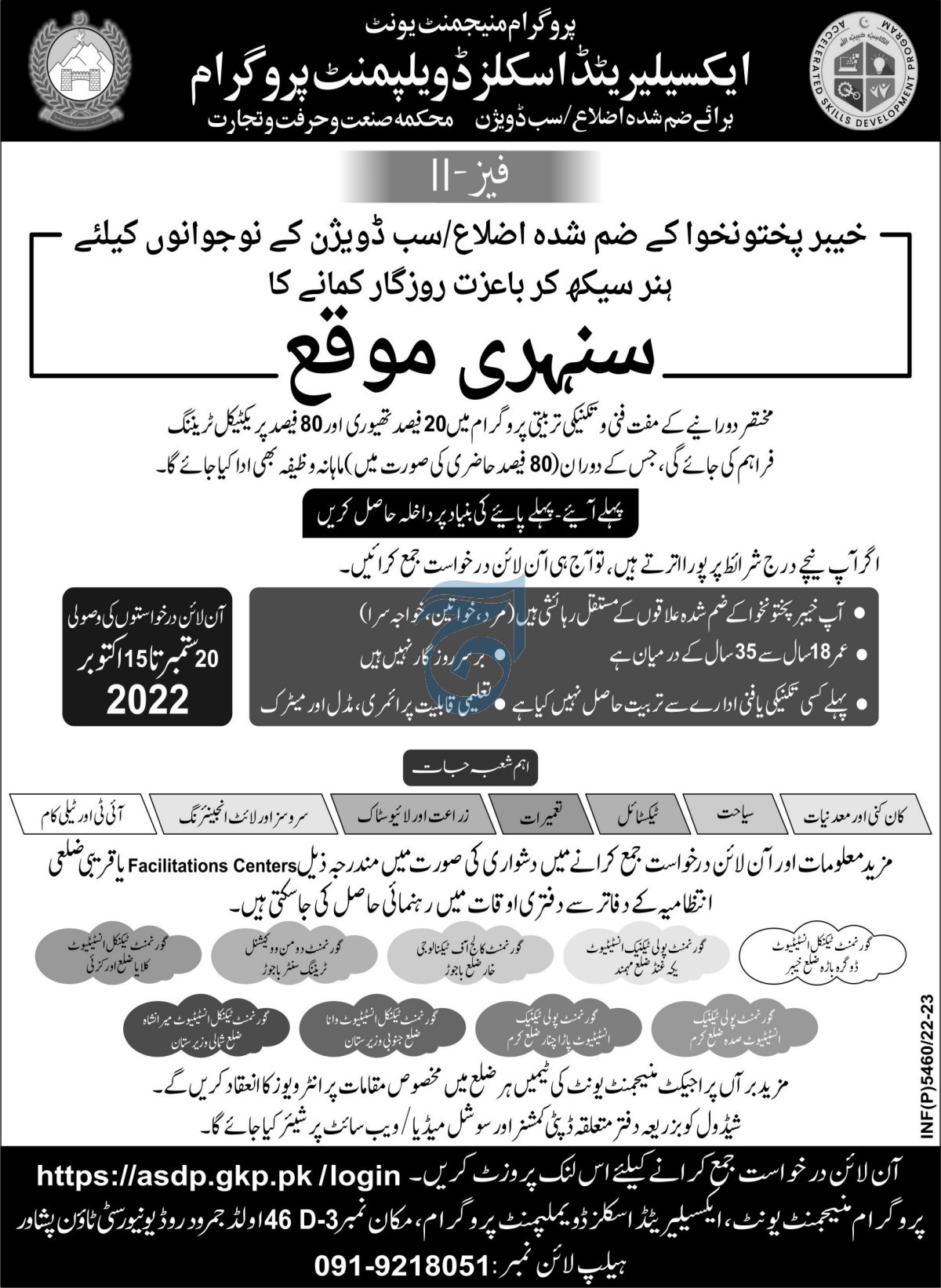 KPK Government have announced Accelerated Skills Development Programs Admissions 2022. For students living in KPK’s merged areas. Candidates with a strong interest in Tourism, Textile, Construction, Agriculture, livestock, services, light engineering, IT and Telecom can enroll in their respective courses by applying for admissions at their Institute. Apply for admission before the admission window closes on 15th of October 2022. Basic Eligibility criteria for admissions are education up to middle or matric.
