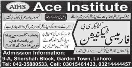 ACE Institute Lahore opens admission in Pharmacy Technician in Lahore.