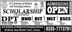 ACE Institute of Medical and Emerging Sciences DPT BSCS Admission 2023