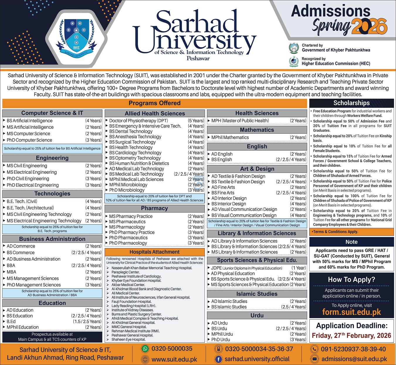 Sarhad University of Science & Information Technology SUIT, a premier chartered institution recognized by the Higher Education Commission HEC, has officially opened its SUIT admissions 2026 cycle for the Spring semester. Established in 2001, SUIT has grown into the largest and top-ranked multi-disciplinary research and teaching private sector university in Khyber Pakhtunkhwa. The university is currently inviting applications across more than 100 degree programs, ranging from Associate Degrees to PhD levels.