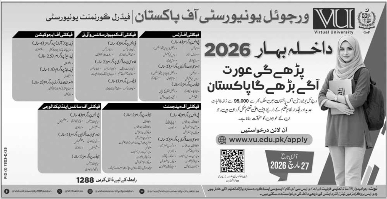 The Virtual University of Pakistan has officially announced its Spring 2026 intake, marking a significant milestone in the countrys digital education landscape. As a federal government institution, VU continues to bridge the gap between high-quality academic standards and accessibility for students across the nation. With over 95,000 female students currently enrolled, the university’s latest campaign, "Parhay gi Aurat, Agay Barhay ga Pakistan," underscores its commitment to inclusive education.]