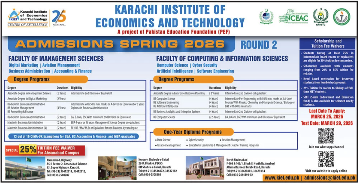 The Karachi Institute of Economics and Technology, a project of the Pakistan Education Foundation PEF, has officially announced its KIET Admissions 2026 for the Spring semester Round 2. This announcement comes as part of the institute’s "25 Years & More" celebration of academic excellence. Prospective students looking for market-driven degree programs can now access the KIET Courses 2026 catalog and KIET Apply Online via the universitys digital portal.