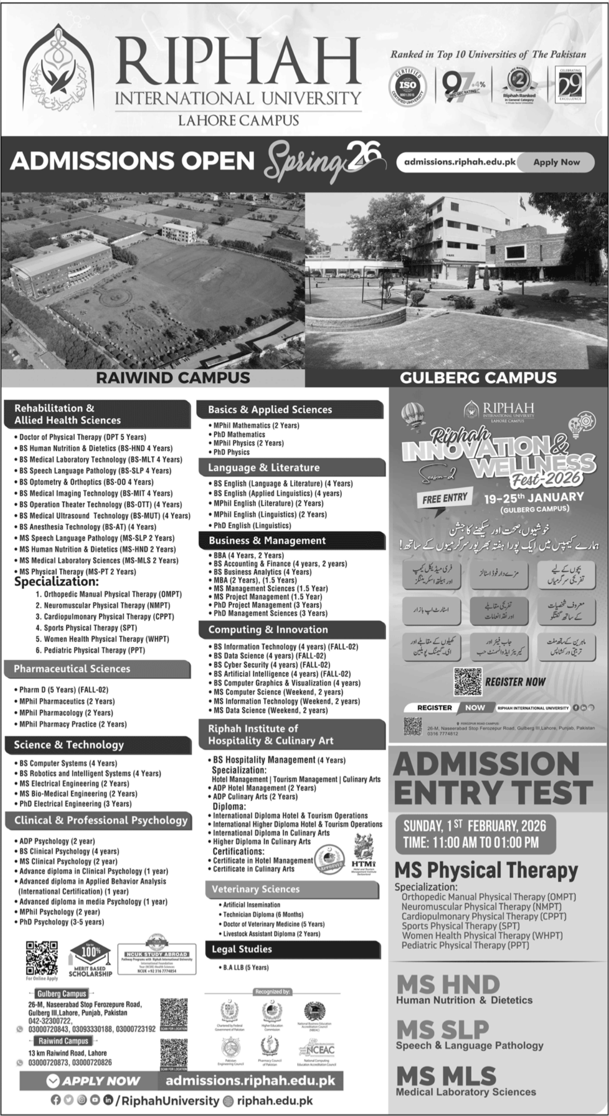 Riphah International University, a premier institution ranked among the top 10 universities in Pakistan, has officially announced the opening of Riphah Admissions 2026 for its Spring session. The university is inviting applications across a vast array of disciplines at its Raiwind and Gulberg campuses in Lahore. With a legacy of 25 years of excellence and ISO certification, the university remains a top destination for students seeking high-quality professional education.