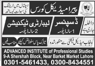 announced admissions in Paramedical Course. Advanced Institute offered admissions for Dispenser and laboratory technician. Matric Pass students can apply for these courses.