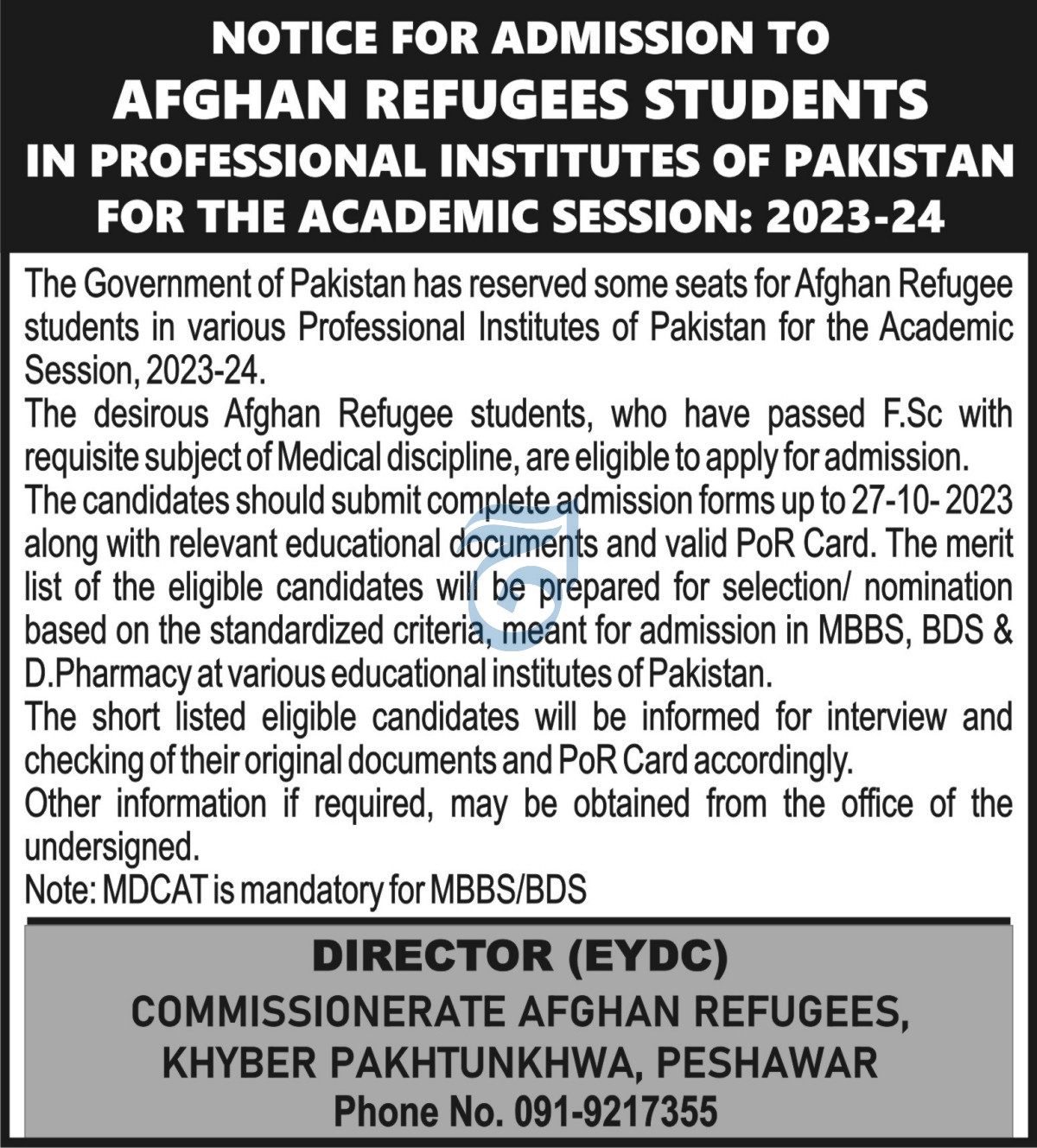 In an effort to extend a helping hand to Afghan refugees residing in Pakistan, the Government of Pakistan has taken a significant step by reserving a number of seats in various professional institutes across the country for the Academic Session 2023-24. This initiative aims to provide educational opportunities to Afghan refugee students who have completed their F.Sc with a focus on the Medical discipline. By offering them access to professional education MBBS BDS D.Pharmacy, Pakistan seeks to support the academic aspirations and dreams of young Afghan refugees.