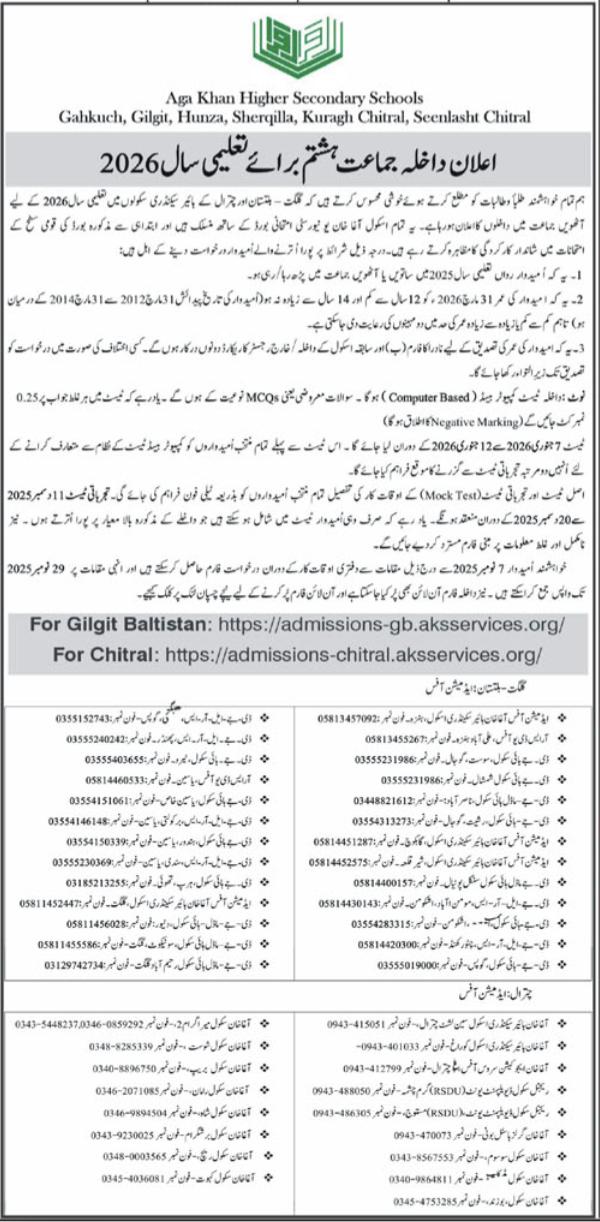 Aga Khan Higher Secondary Schools in Gahkuch, Gilgit, Hunza, Shergilla, Kuragh Chitral, and Seenlasht Chitral are pleased to announce admissions for Class 8 for the Academic Year 2026. These schools are affiliated with the Aga Khan University Examination Board and have consistently demonstrated outstanding academic performance in national and board-level examinations.
