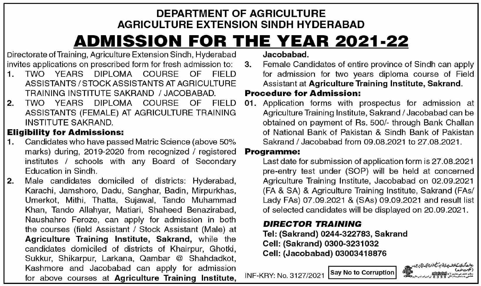 Directorate of Training, Agriculture Extension Sindh Hyderabad is offering Applications for Admissions Two years Diploma Course of Filed Assistants / Stock Assistants at Agriculture Training Institute Sakrand / Jacobabad and Two Years Diploma Course of Field Assistants Female at Agriculture Training Institute Sakrand. Last date for submission of Applications is August 27, 2021. Pre entry Test under SOPs will be held on September 02, 2021. Result List will be displayed on September 20, 2021. Admissions are open for the year 2021-2022.