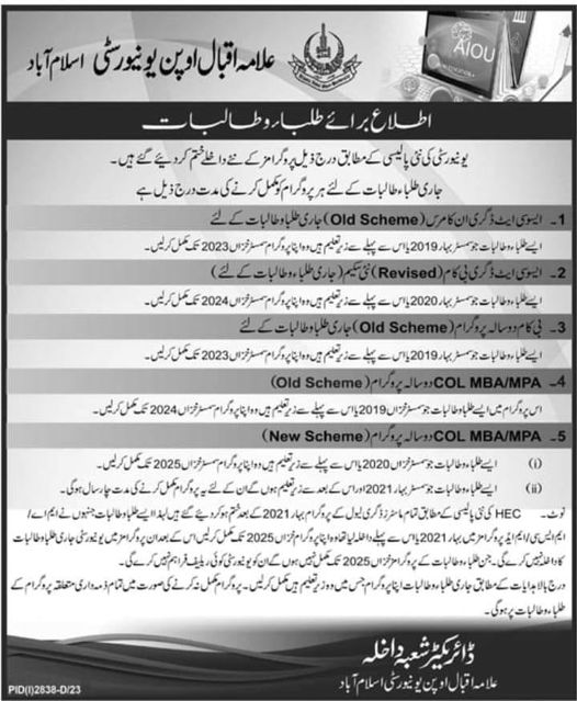 Islamabad, Allama Iqbal Open University Islamabad has already started various courses at the Associate Degree of Arts, Commerce under old scheme and revised scheme. Now the administration of the university has made announcement that AIOU Finishes ADA & ADC Admissions Under New Policy. The students are instructed to complete their respective courses by Fall semester 2023.