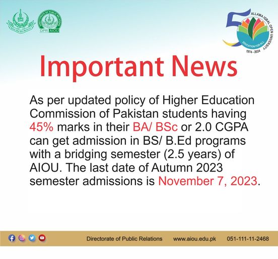 Islamabad, Allama Iqbal Open University is commencing its admission process for the upcoming BS and B.Ed programs. These admissions are available to candidates who have successfully passed their BA and BSc exams with a minimum of 45% marks or a 2.0 CGPA, along with a bridging semester of 2.5 years in accordance with the revised policy by the Higher Education Commission.
