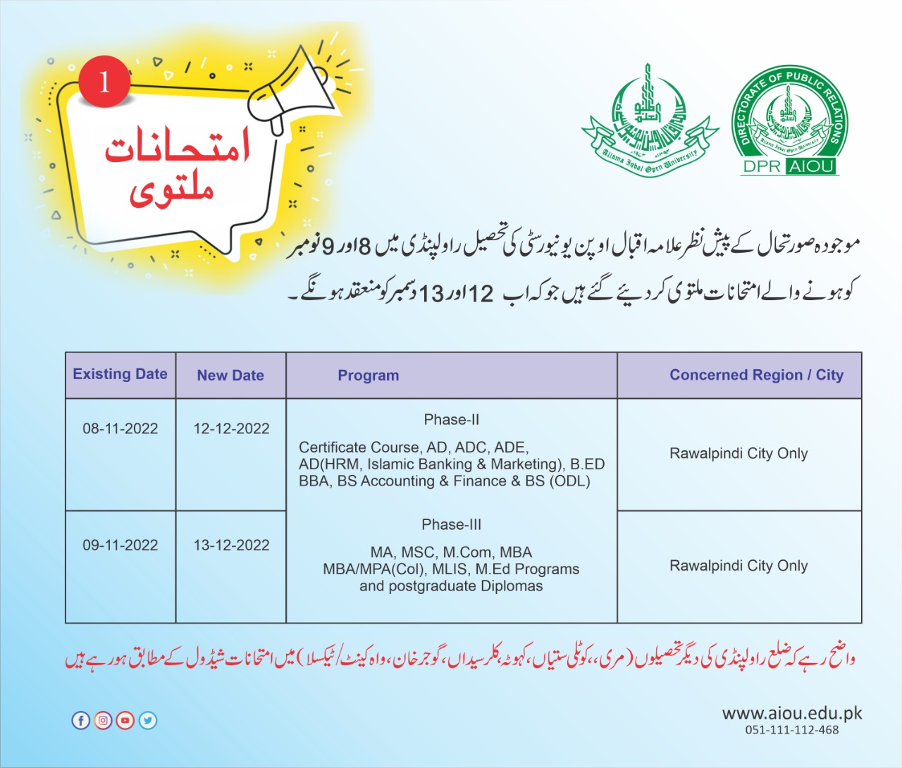 Islamabad, Allama Iqbal Open University Islamabad is managing the exams of Associate Degree Programs, BBA, BS Accounting & Finance, & B.Ed, MA, MSc, MBA, M.Ed, M.Com, MLIS and PGD courses in various cities of Pakistan. Due to law and order situation in Rawalpindi city, the exams department of AIOU announced that AIOU Exams in Rawalpindi City 2022 Postponed, which were going to conduct on 08 & 09-11-2022. Now AIOU has announced that their postponed papers will be re-scheduled on 12-12-2022 and 13-12-2022. The exams in other parts of Rawalpindi district will be continued as usual. The candidates of Rawalpindi city should note it and they will appear in the exams on the revised schedule.