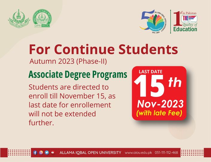 Allama Iqbal Open University Islamabad is ready to welcome continued students seeking admission to the Associate Degree Programs for the autumn semester of 2023 Phase-III. The eager students initiated the submission of admission forms for these ADP degree programs, and now, in a generous move, the AIOU admission department announces AIOU Extends Autumn Admission 2023 AD Programs.