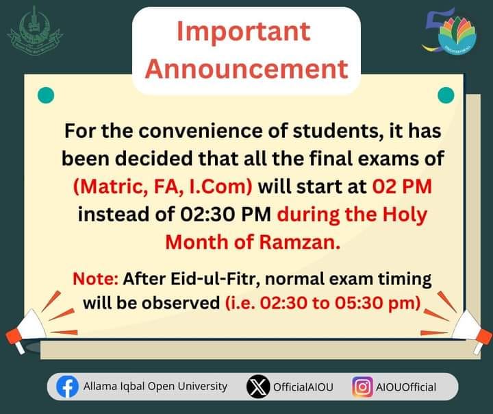 For students participating in their SSC, HSSC, and I.Com final exams during the second shift, its imperative to take note of this timing adjustment and ensure their presence accordingly. They should acquaint themselves with the revised AIOU final exams Ramadan timings, marking the beginning of their papers at 2:00 pm in the second shift. Following the conclusion of Eid-ul-Fitr festivities, the timing for the second shift will revert to its original schedule of 2:30 pm to 5:30 pm.