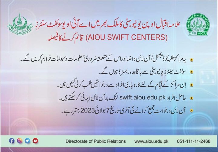 Allama Iqbal Open University Islamabad is embarking on an initiative to establish swift centers across the country. These centers aim to provide comprehensive assistance and support to candidates enrolled in various programs and disciplines offered through distance learning. The establishment of these centers underscores AIOUs commitment to facilitating a seamless learning experience for its students.