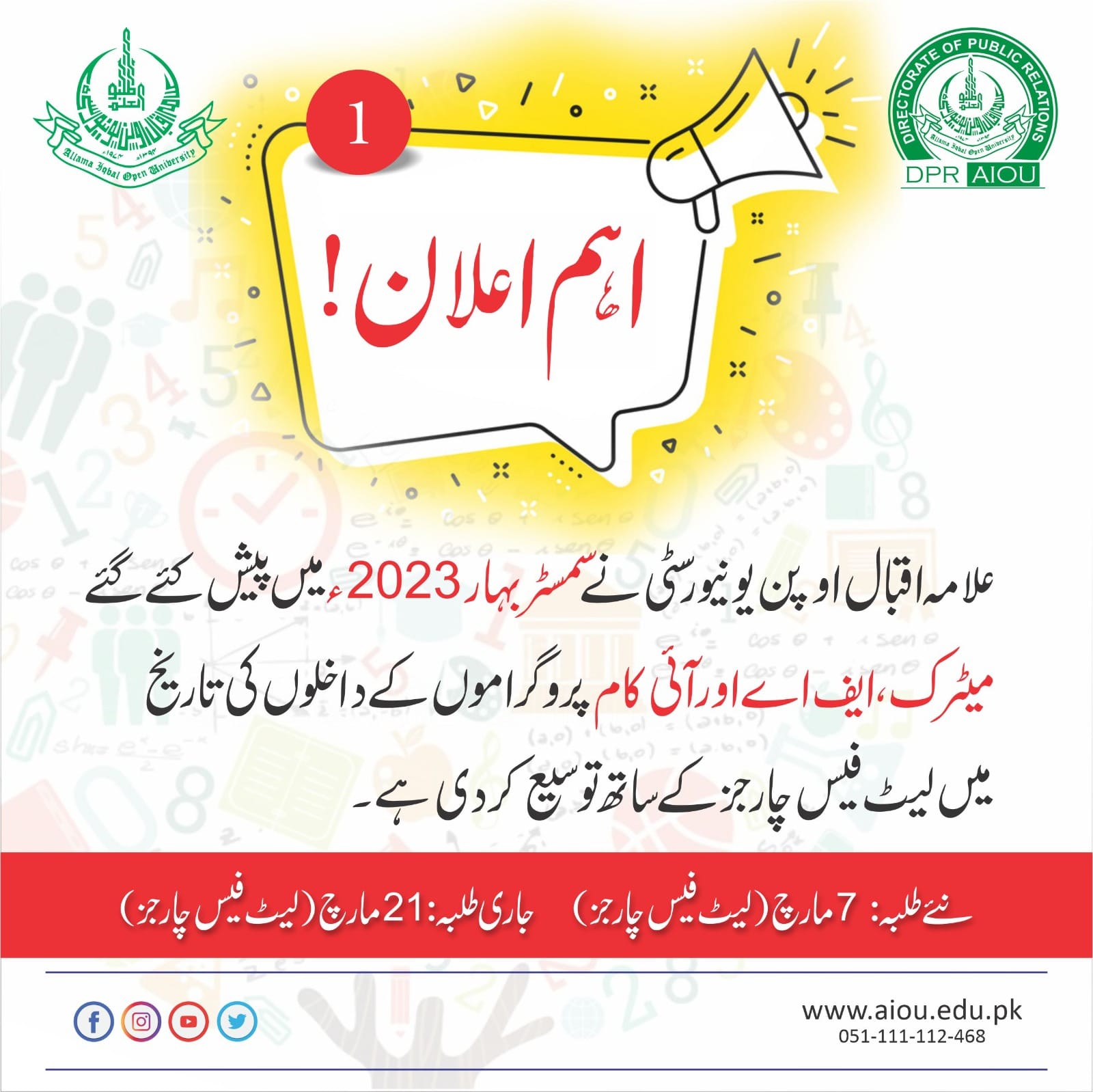 AIOU Matric FA & I.Com Spring Semester Admission Schedule 2023 Extension