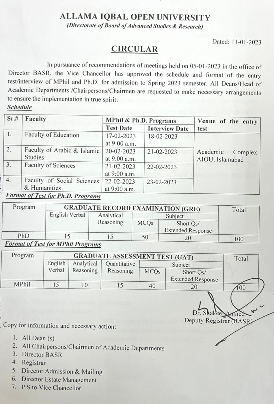 AIOU MPhil &PhD Spring Semester Entry Test / Interview Schedule 2023