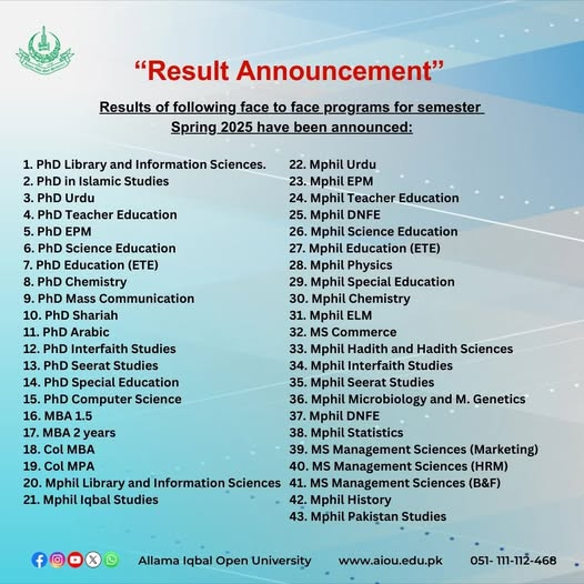 Allama Iqbal Open University Islamabad has started the exams process for different programs at different levels for the spring semester 2025. The AIOU has conducted their face to face program exams few weeks earlier and now the exams section has declared their AIOU Spring Semester Face to Face Programs 2025 Result.