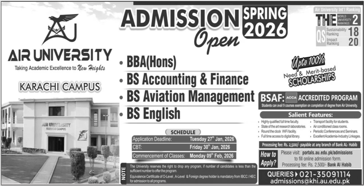Air University, recognized for its academic excellence, has officially opened admissions for the Spring 2026 session at its Karachi Campus. The university is currently ranked #2 in the THE World University Rankings and holds top positions in Sustainability and Impact rankings. Prospective students are encouraged to apply for AU Admissions 2025-2026 to join a globally recognized institution with state-of-the-art research facilities.